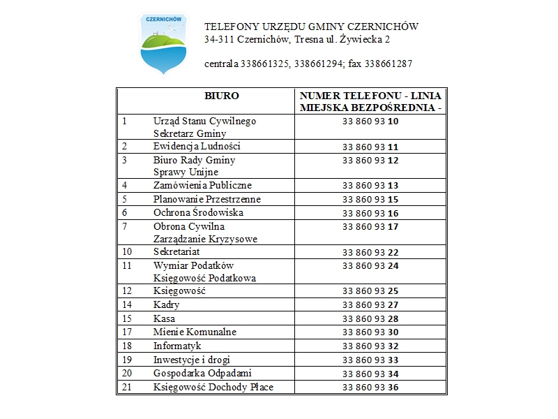 Urząd Gminy Czernichów: tel. 33 866 13 25, fax 33 866 12 87, e-mail: