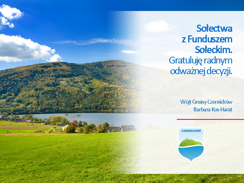 Gratuluję odważnej decyzji, która jest dużym wyzwaniem zarówno dla systematycznie równoważonego budżetu Gminy Czernichów, jak i dla Sołtysów, Rad Sołeckich oraz Mieszkańców. Jest to nowość w historii Gminy Czernichów - Fundusz Sołecki w Polsce funkcjonuje od 2009 roku. Życzę Sołtysom, Radom Sołeckim i Mieszkańcom realizacji samych dobrych zadań oraz determinacji w dążeniu do poprawy warunków życia mieszkańców.