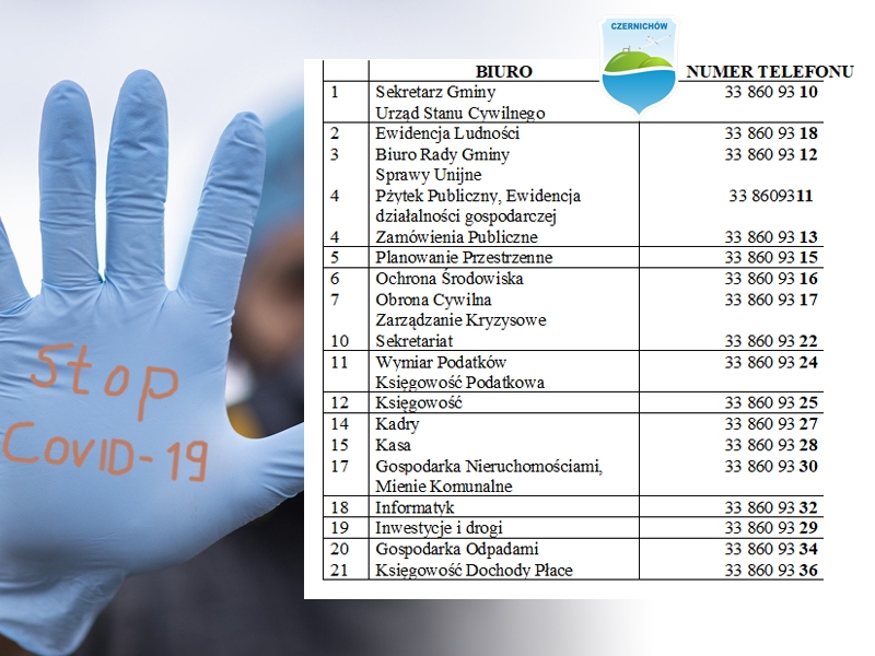 Szanowni Państwo, Drodzy Mieszkańcy Gminy Czernichów, z uwagi na dramatyczną sytuację związaną z zachorowaniami na COVID-19 zwracam się z apelem o solidarne i odpowiedzialne przestrzeganie zasad sanitarnych. W trosce o Wasze i nasze zdrowie apelujemy, aby sprawy załatwiać telefonicznie. Prosimy również korzystać w komunikacji z Urzędem Gminy z formy elektronicznej, tj. wysyłania pism pocztą e-PUAP lub drogą e-mailową na adres: gmina@czernichow.com.pl. W przypadku jednak konieczności złożenia dokumentów osobiście prosimy o wcześniejszy kontakt telefoniczny celem umówienia wizyty. Korespondencje należy wrzucać do skrzynki umieszczonej przed wejściem do Urzędu Gminy.