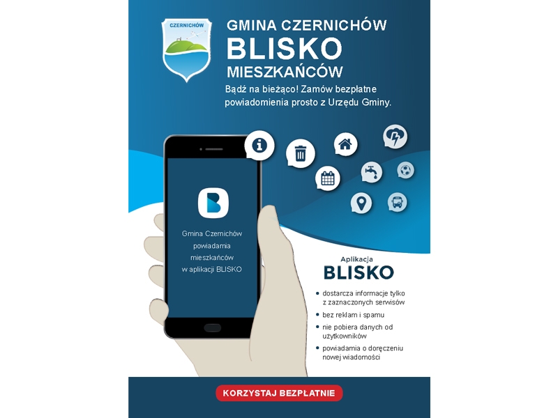 Wójt Gminy Czernichów Barbara Kos-Harat uruchomiła nowoczesny system mobilnej komunikacji z mieszkańcami. Za pomocą sprawdzonego w setkach samorządów systemu będziemy na bieżąco informować mieszkańców o najważniejszych wydarzeniach bezpośrednio na telefon lub tablet! System dla użytkowników jest bezpłatny i restrykcyjnie przestrzega zasad wymaganych przez RODO. W systemie można zarejestrować się pobierając na smartfona lub tablet BEZPŁATNĄ aplikację BLISKO.