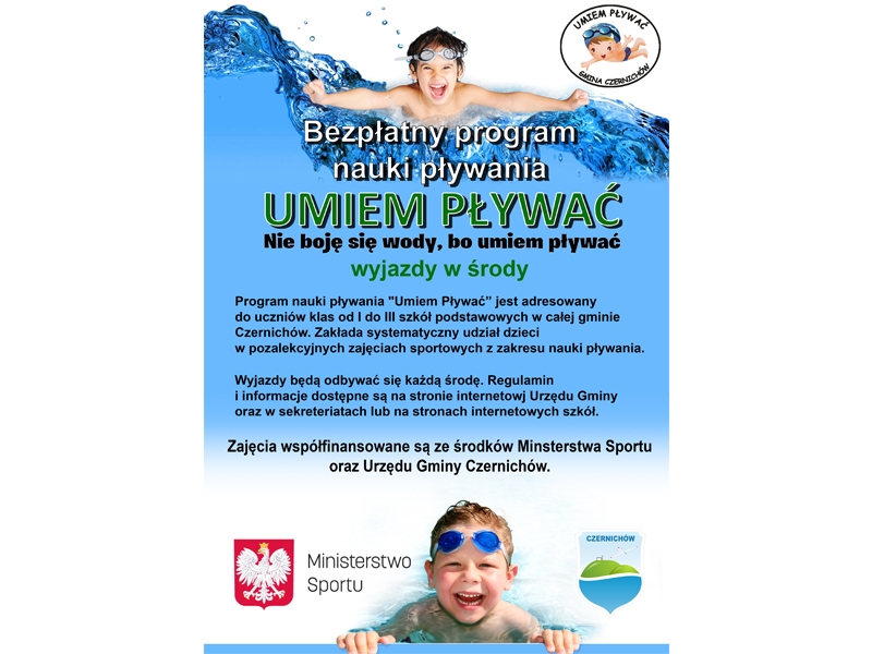 Od 26 maja 2021r. rusza program nauki pływania „NIE BOJĘ SIĘ WODY, BO UMIEM PŁYWAĆ”. W programie weźmie udział 48 uczniów klas od I-III szkół podstawowych Gminy Czernichów. Naukę pływania będzie prowadziło 4 wykwalifikowanych instruktorów. W realizację programu zostali zaangażowani również wolontariusze.
