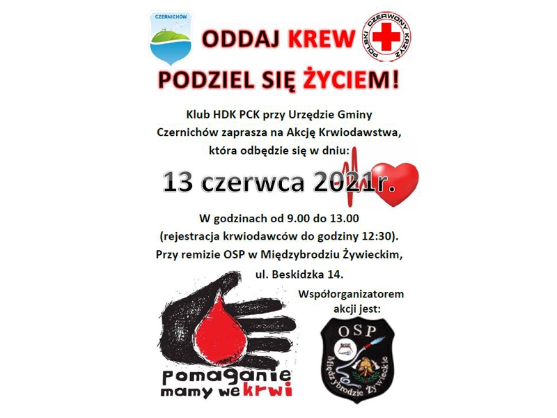 Klub HDK PCK przy Urzędzie Gminy Czernichów zaprasza na Akcję Krwiodawstwa, która odbędzie się 13 czerwca. W godzinach od 9.00 do 13.00 (rejestracja krwiodawców do godziny 12:30). Przy remizie OSP w Międzybrodziu Żywieckim, ul. Beskidzka 14.